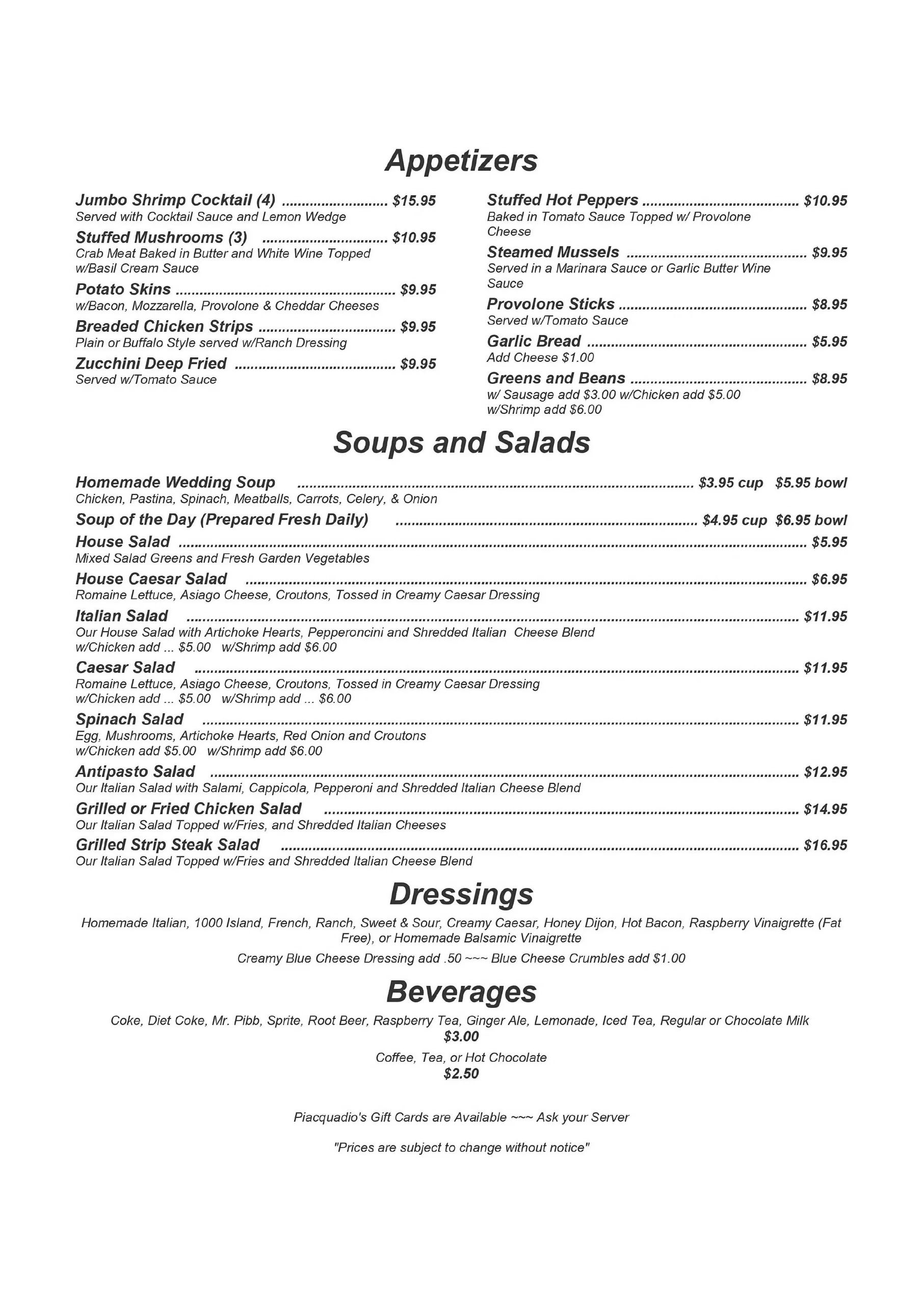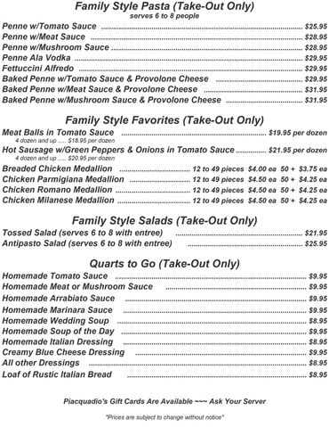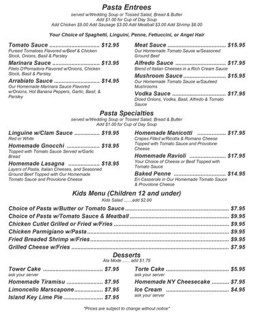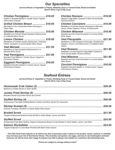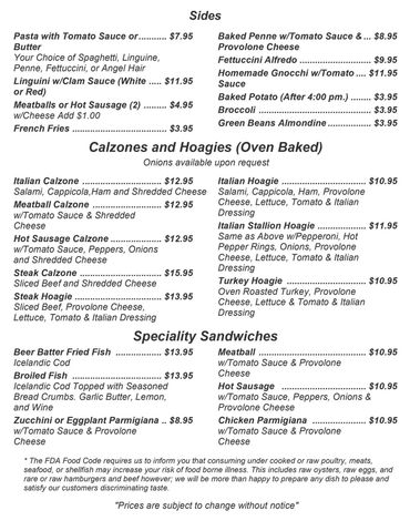 Many menu choices including Appetizers, Specialty Veal and Chicken Entrees, Pasta Entrees, Steaks and Seafood. Including Hoagies, Calzones, and Specialty Sandwiches. Don't feel like cooking, See Our Family Style Menu below.